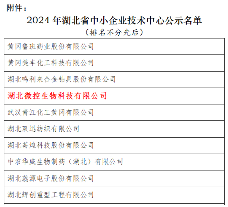 近日,根據(jù)湖北省經(jīng)濟和信息化廳發(fā)布的《關(guān)于2024年湖北省中小企業(yè)技術(shù)中心名單的公示》,湖北微控生物科技有限公司榜上有名。此次申報的湖北省中小企業(yè)技術(shù)中心,是湖北省為推動中小企業(yè)專精特新發(fā)展而設(shè)立的重要創(chuàng)新平臺。公司憑借擁有自主知識產(chǎn)權(quán)的工藝技術(shù)優(yōu)勢及在行業(yè)內(nèi)領(lǐng)先水平的資深研發(fā)團隊。順利通過嚴格的審核評估